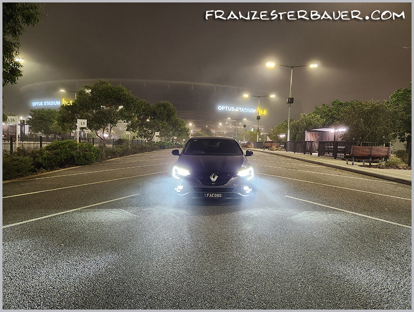 The Renault Megane RS Trophy 300 at Optus Stadium on a foggy night.