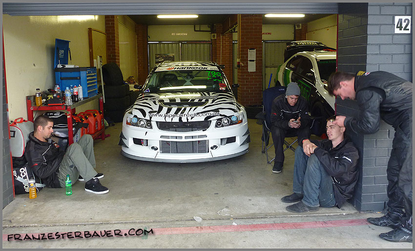Eventual winners Nemo Racing shared the garage next to the Hippo Creek/Allstar Garage Evo 9 at WTAC at Sydney Motorsport Park