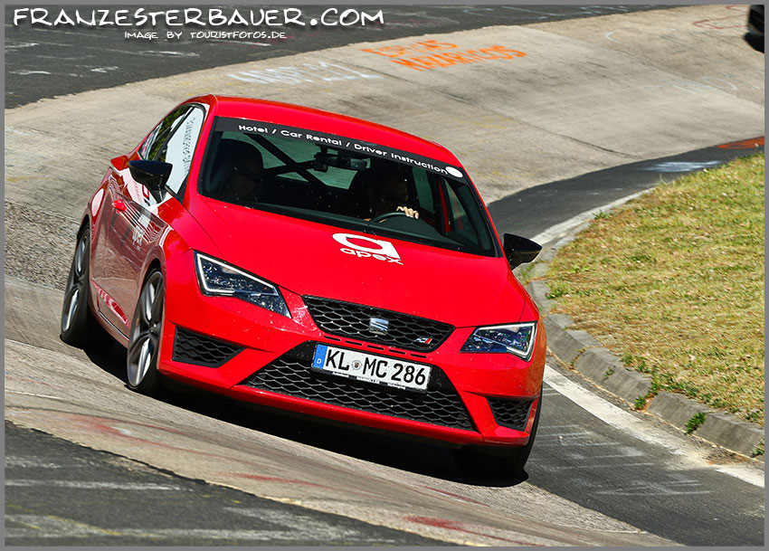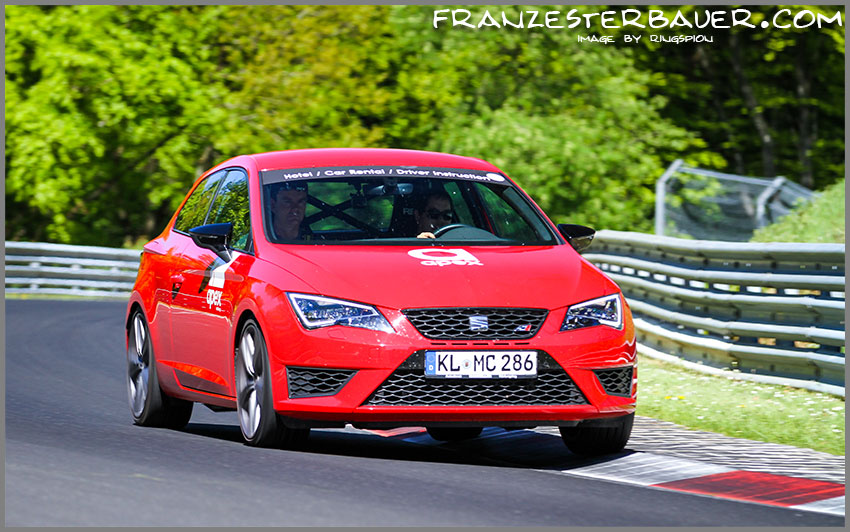 Riding the kerb at Eiskurve at the Nordschleife, Nurburgring in Apex Nurburg's Seat Leon Cupra
